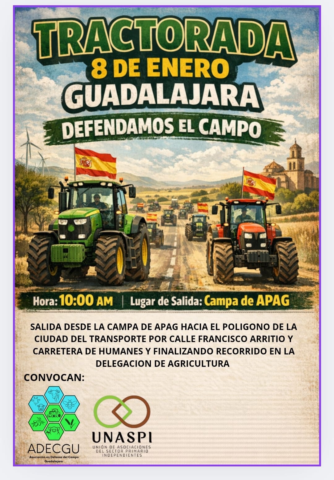 El sector primario y el mundo rural guadalajareño vuelve mañana jueves 8 de enero a alzar la voz. Agricultores, ganaderos de Guadalajara están llamados a protagonizar una nueva tractorada en defensa del campo. La convocatoria parte de la UNASPI (Unión de asociaciones del sector primario independientes) y aquí en Guadalajara la lidera ADECGU (Asociación en defensa del campo de Guadalajara).